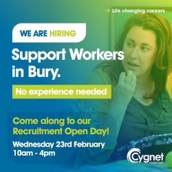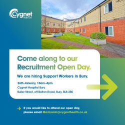 Cygnet Hospital Bury are looking for full time Support Workers with a passion for delivering outstanding care. Join us at our free open day on Wednesday 26th January – meet the team, ask questions and find out more about this amazing opportunity.