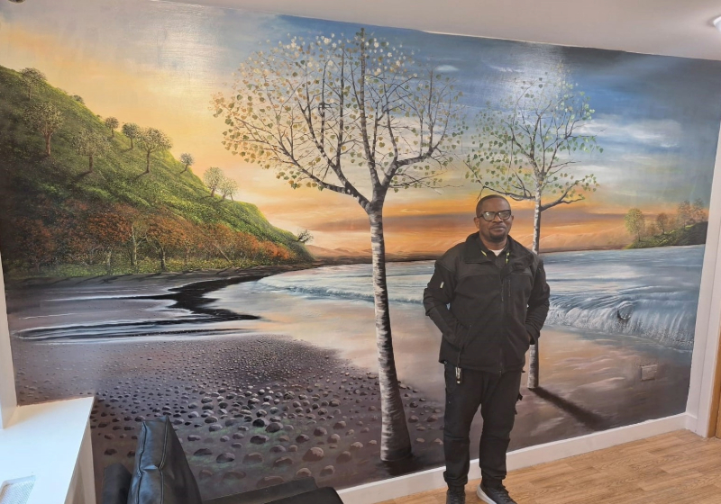 Drawing inspiration from nature, Chidi worked closely with the people we support to select a beach-themed design that would promote relaxation and wellbeing in their quiet space. Over the course of two weeks, he carefully created the artwork, transforming the room into a peaceful retreat.