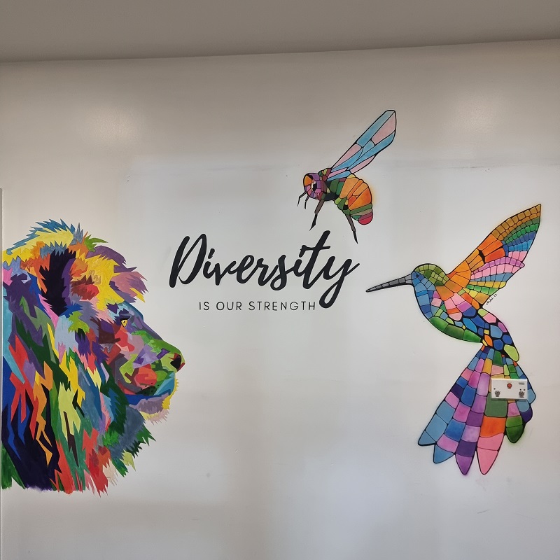 Charmaine Twidale, Cygnet’s Co-production Artist, has recently completed a new mural at Cygnet Hospital Bierley. The project started when Charmaine visited the hospital to chat with service users about ideas for murals they’d like to see and co-produce ideas. The theme of Diversity was picked for one of the main corridors.