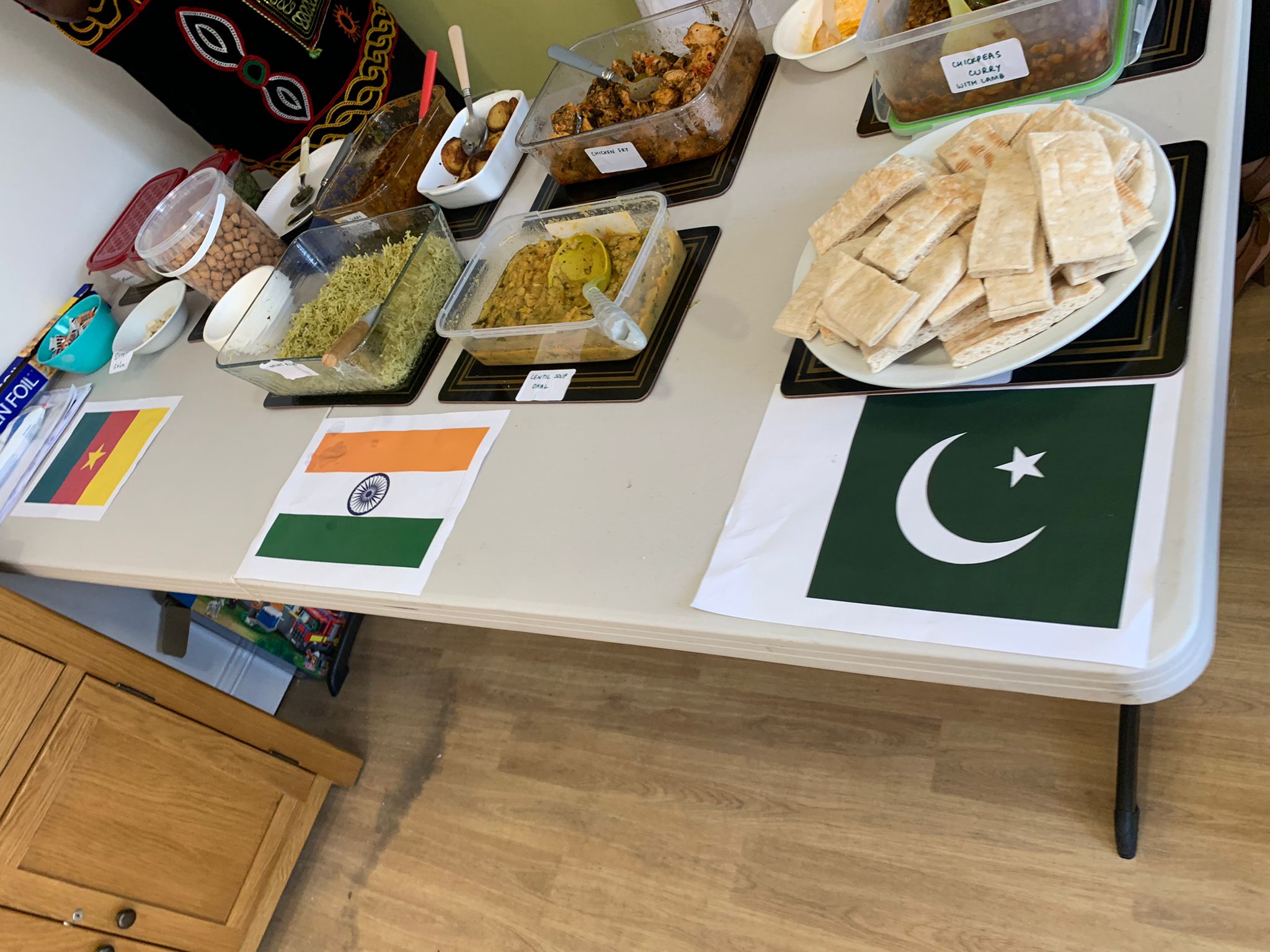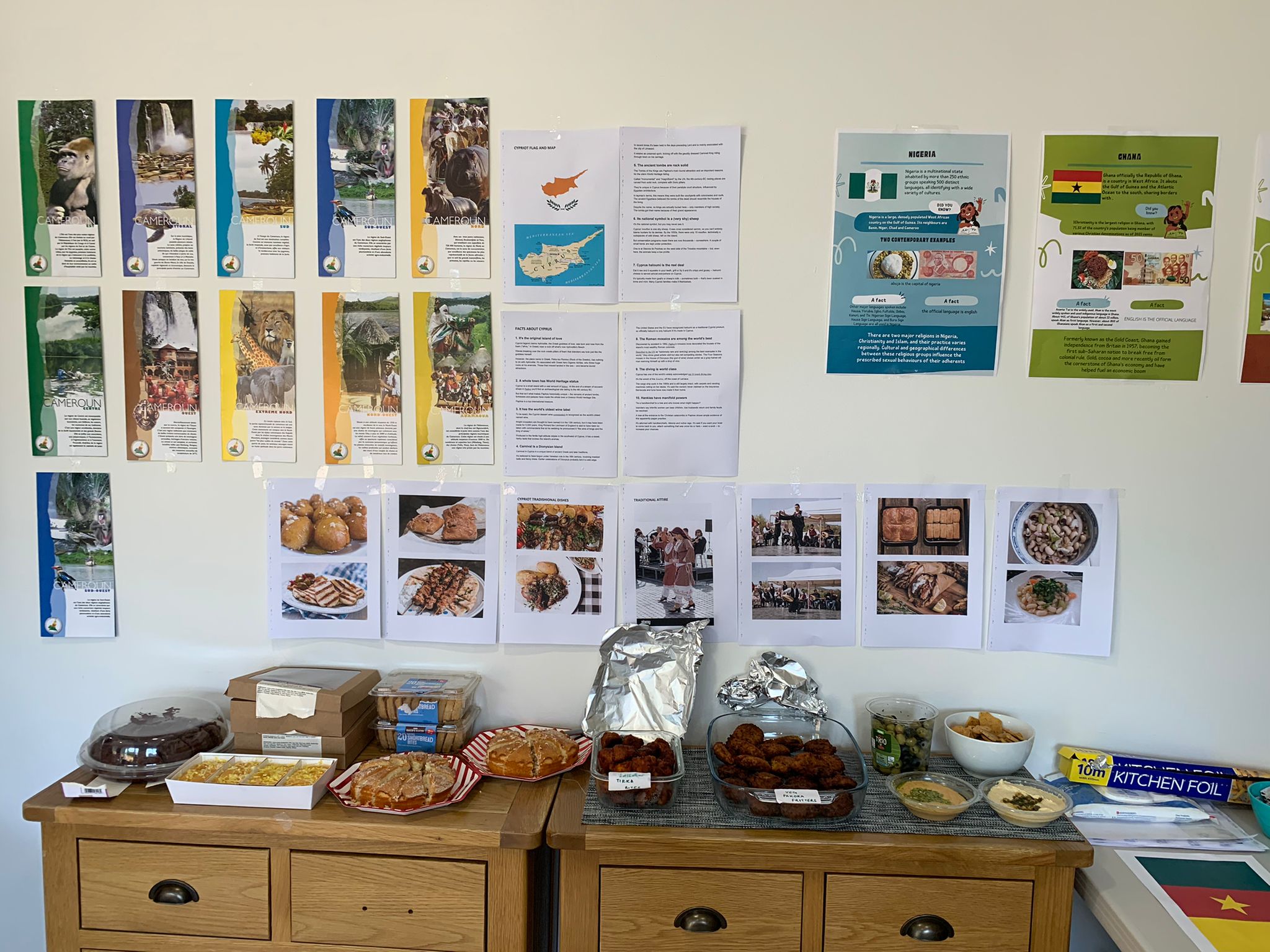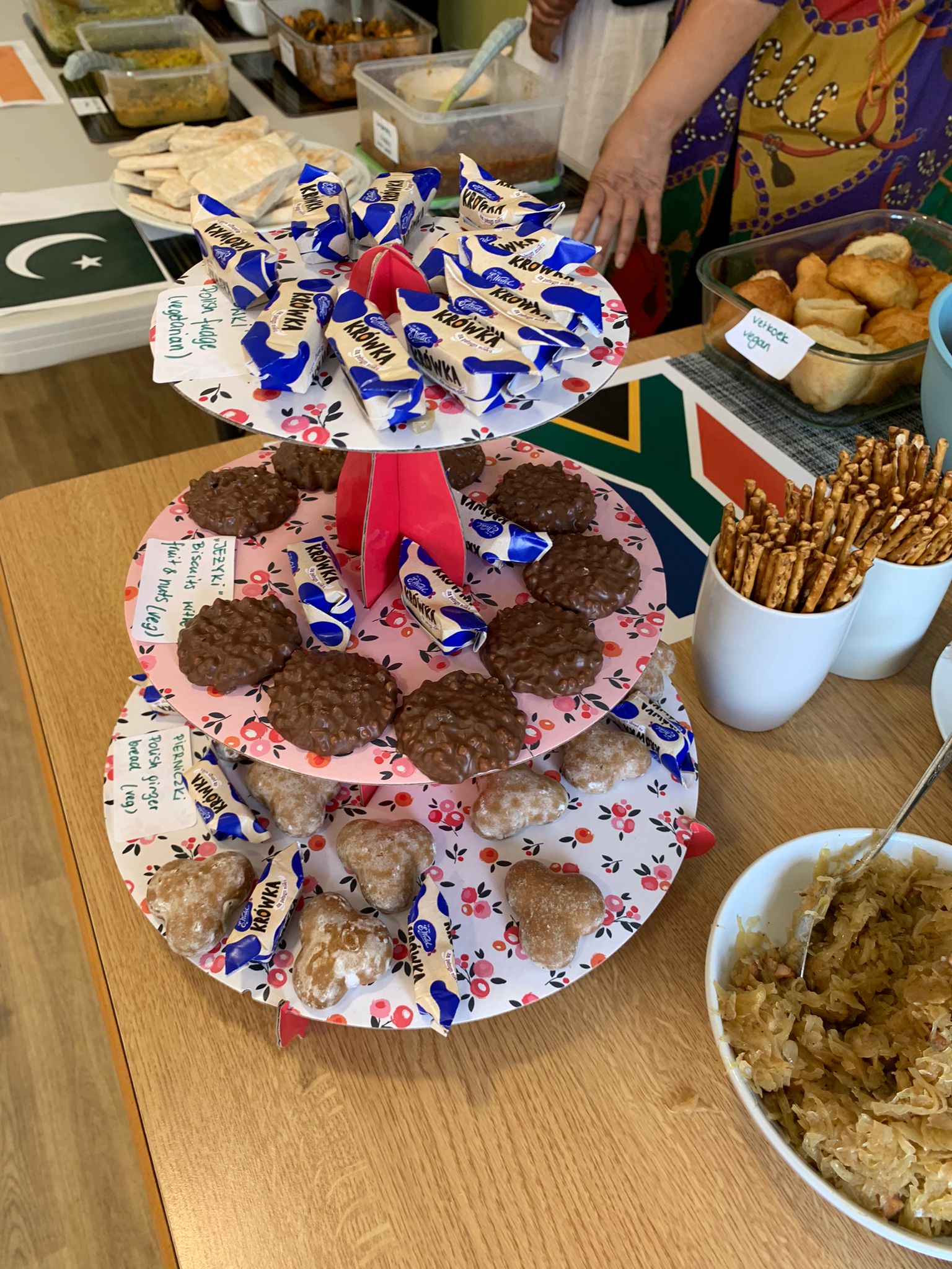 The centre was decorated with posters, flags, and fun facts about more than 15 countries. Various national dishes were displayed on a long table in the main hall for sampling, with popular tunes from these countries playing in the background. A world map was displayed with everyone encouraged to decorate their country of origin – which quickly became full of colour.