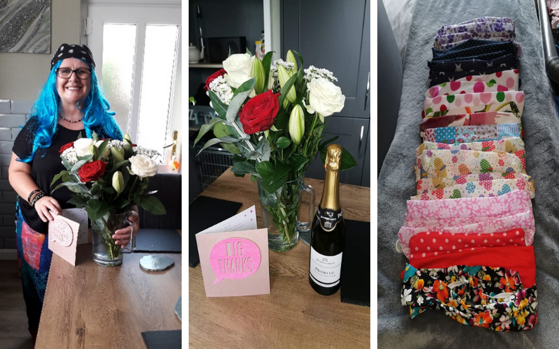 Firstly, local midwife Bernie Kenyon answered the call by making a selection of head bands to help those wearing PPE. Despite her own challenges as a midwife working on the busy wards during COVID-19, Bernie took the time to help. The team presented Bernie with some gifts to say a big thanks.
