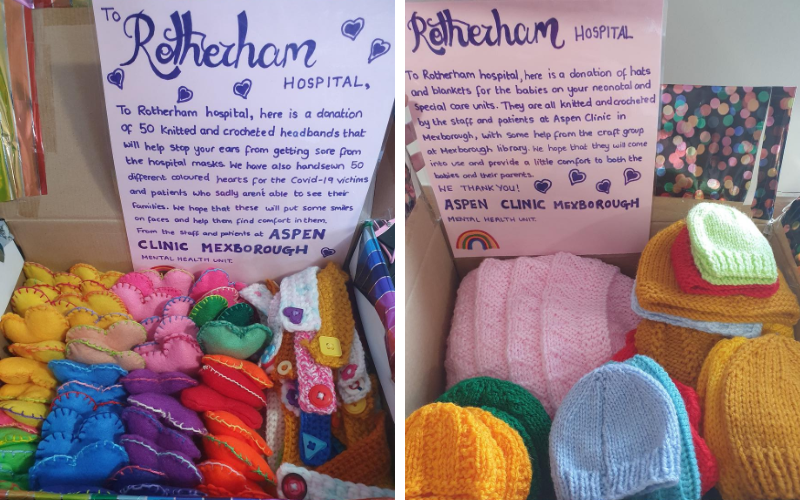 Service users have also joined forces with a local craft group at Mexborough Library to knit and crochet 18 baby blankets and 150 baby hats, which were donated to neonatal units at three local hospitals. Another project was to make up 60 gift bags which were donated to two local nursing homes. Each gift bag contained a handmade card, hand sewn love heart, pen and refreshments.