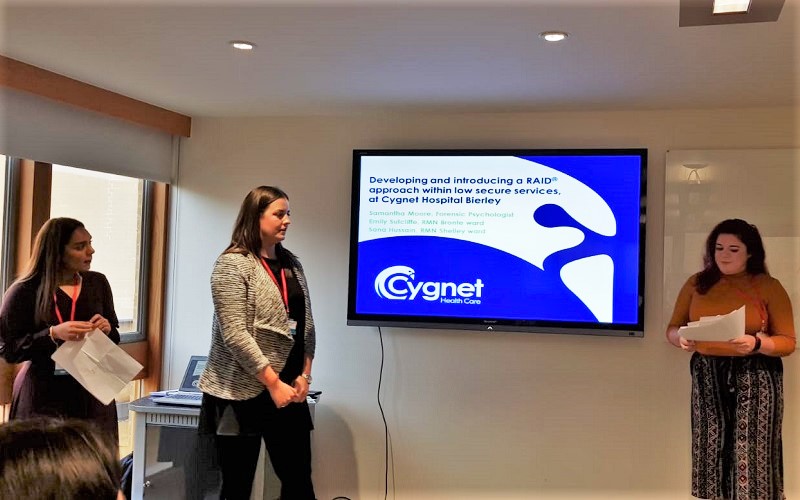 The team were also up for the APT Award for Excellence in RAID 2019 for their implementation of the RAID approach across the hospital’s low secure services, Bronte and Shelley Ward. The implementation of the approach was a multidisciplinary team effort, presented at the APT Awards by Samantha Moore (Forensic Psychologist), Emily Sutcliffe (Registered Mental Health Nurse on Bronte Ward) and Sana Hussain (Registered Mental Health Nurse on Shelley Ward). The RAID presentation was praised for its structure, and the implementation of the approach described as ‘beautifully planned and executed.’
