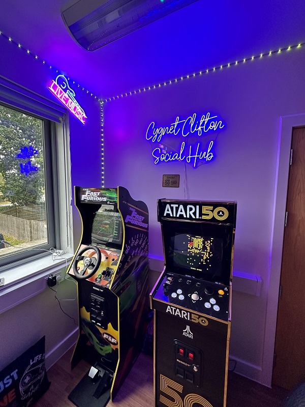 A room at the hospital has been given a stunning makeover and converted into a ‘social hub’, complete with arcade games, sensory lighting, music facilities, TV screens, electronic goods, VR headset, a guitar, inspirational artwork, board games, comfortable seating and much more to ensure service users have a safe space where they can relax and socialise together.