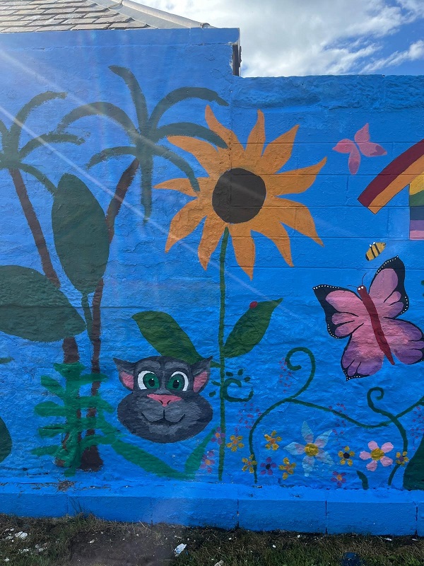 The inspiration for painting the garden walls came from the monthly service user meeting. The residents wanted to liven up the garden, and Claire, along with Kerry Gibson, the Activity Coordinator, took on the task of painting the walls. They printed pictures of the residents’ ideas, and the residents then chose their preferred designs. Claire worked to incorporate all the requests and to personalise the project.