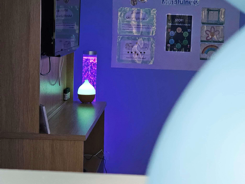 Equipment inside the room was all chosen by the service users themselves. It includes; Bubble tubes, scented diffuser, sound machine, mindfulness resources, sensory fidgets, cuddle balls, dimmable and mood lighting, soft furnishings and infinity mirrors.
