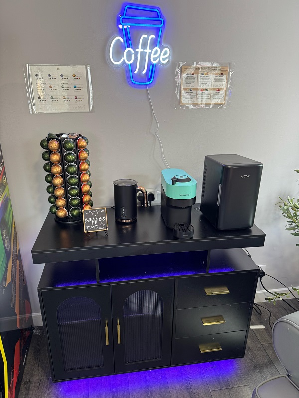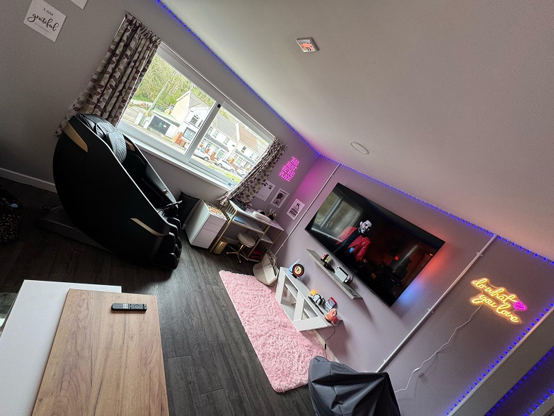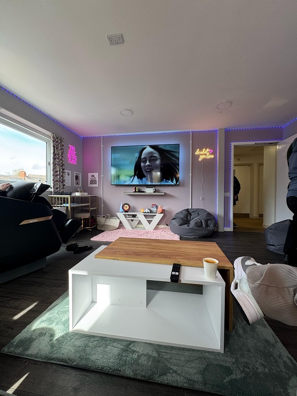The redesigned room now features gaming stations, a coffee bar, nail salon, massage chair, sensory lighting, arcade games, TV screens, music facilities, Harry Potter-themed décor, and cozy seating areas.