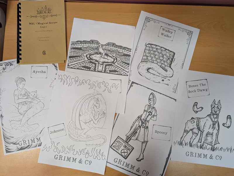 Following the workshops, Grimm & Co.’s creative team illustrated the students’ characters, producing bespoke colouring sheets and bound storybooks now proudly displayed in the Phoenix School library.