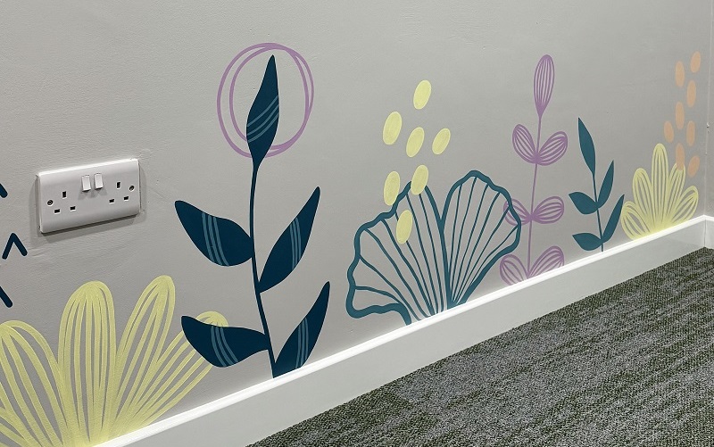 On Crocus Ward, again a total of five murals were painted. A full leafy border was painted along the bottom of the walls within the sensory room, using subtle colour to create a calming atmopshere within the space.