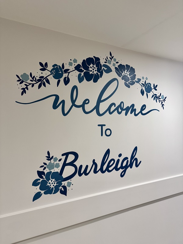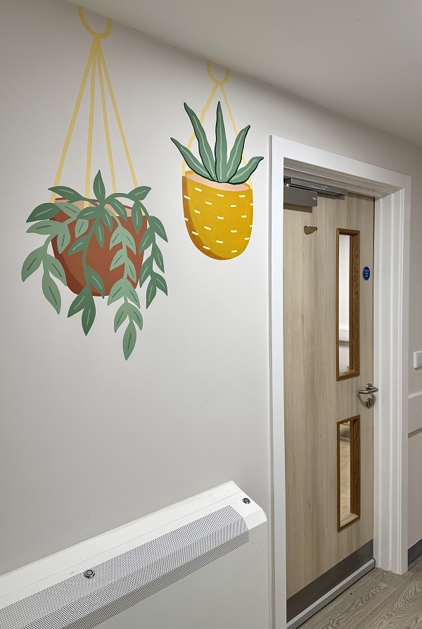 On Burleigh Ward, the first is a ‘Welcome to Burleigh’ mural which is located on the corridor after you enter the building through the main entrance. The design surrounding the text is inspired by Burleigh pottery, adding a feature to the space.