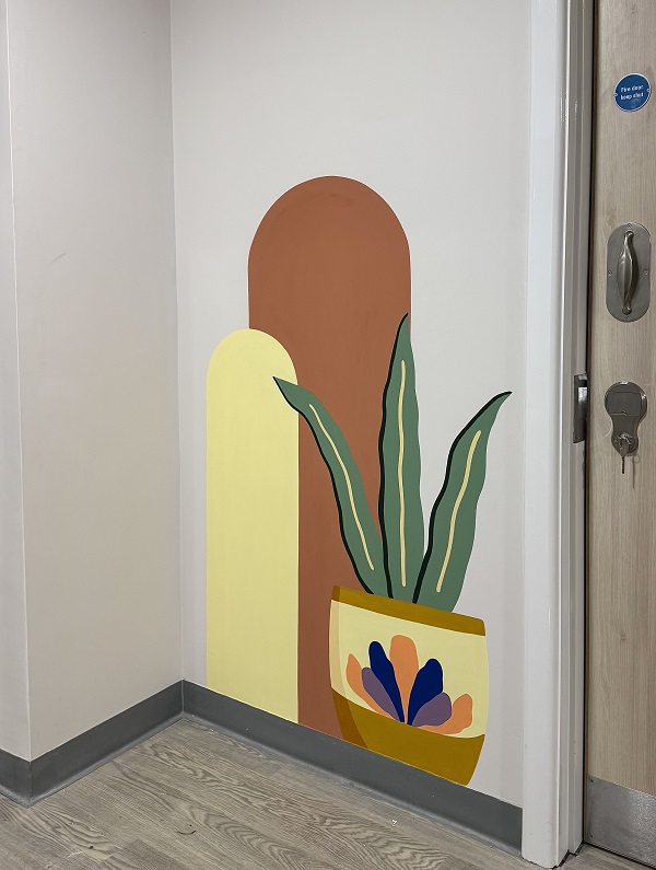 The other two murals within the corridor were a set of hanging baskets and a large planter. Inspiration was taken from Clarice Cliff’s crocus pottery design, which can be seen through the colour palette used and the crocus design on the planter.