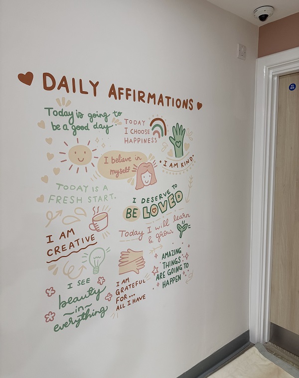 Down one of the corridors a mural of ‘Daily Affirmations’ was painted, promoting positivity and complimenting the mural that was painted at Cygnet Kenney House. With this one adapting the